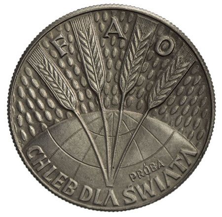 Polska moneta próbna wydana przez Mennicę Warszawską o nakładzie 51 800 sztuk. Moneta upamiętnia Organizację Narodów Zjednoczonych do spraw Wyżywienia i Rolnictwa - Chleb dla Świata.