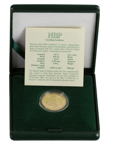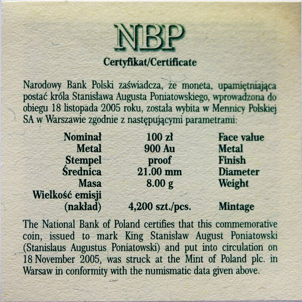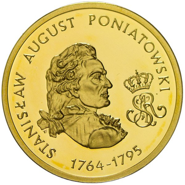 Polska złota moneta o nominale 100 złotych i nakładzie 4 200 sztuk. Moneta upamiętnia króla Polski Stanisława Augusta Poniatowskiego. Panował w latach 1764-1795. Ostatni król Rzeczpospolitej Obojga Narodów. Utworzył elitarną szkołę rycerską, organizował obiady czwartkowe na które zapraszał pisarzy, poetów, uczonych. W dniu 3 maja 1791 sejm uchwalił nową konstytucję państwową. Zgodnie z postanowieniami konstytucji król stanął na czele Straży Prawa, zyskując tym samym kierownictwo dyplomacji polskiej i polityki zagranicznej państwa oraz kontrolę nad działalnością władz wykonawczych. Była to pierwsza konstytucja w Europie i druga na świecie. Panowanie króla Stanisława Augusta Poniatowskiego doprowadziło do trzech rozbiorów Polski.