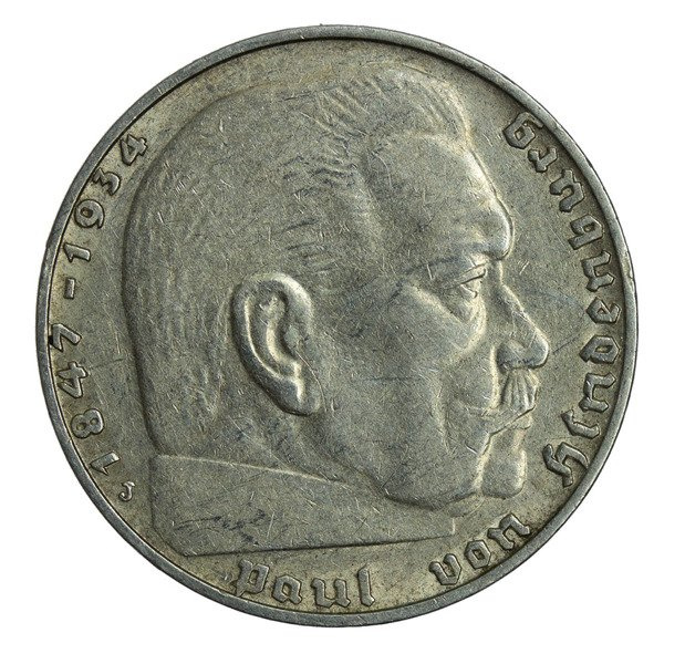 Niemiecka srebrna moneta o nominale 2 marek. Na monecie przedstawiony jest prezydent Republiki Weimarskiej i III Rzeszy Paul von Hindenburg.
