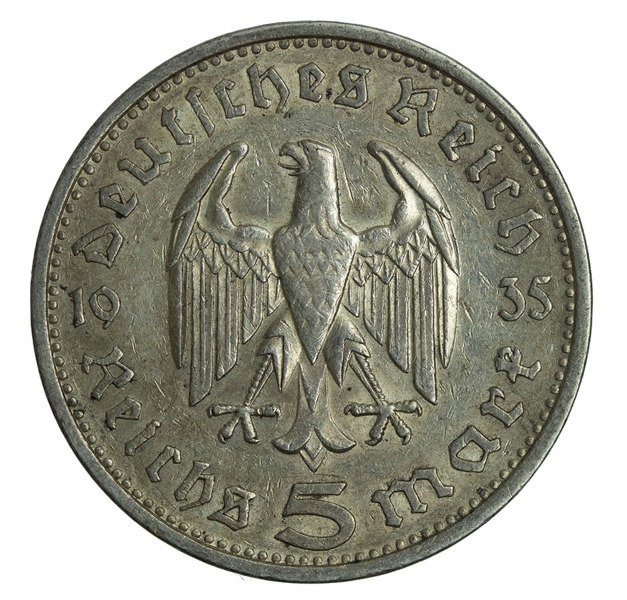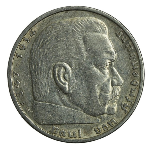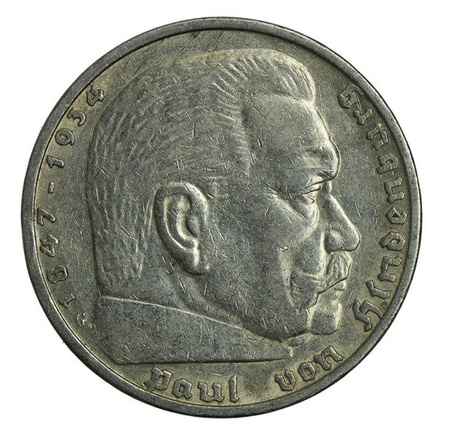 Niemiecka srebrna moneta o nominale 5 marek. Na monecie przedstawiony jest prezydent Republiki Weimarskiej i III Rzeszy Paul von Hindenburg.