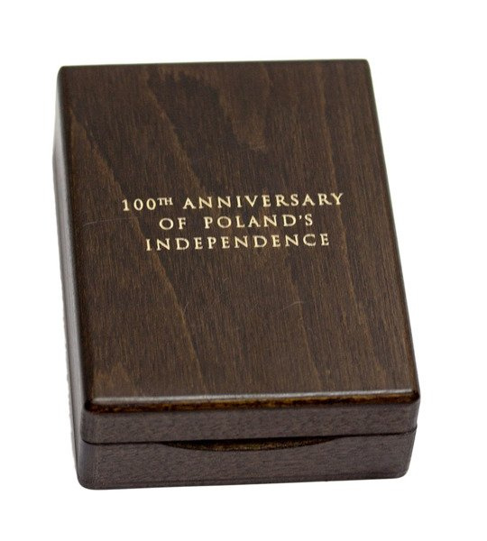 Moneta w ochronnym etui i plexi, całość w drewnianym etui.