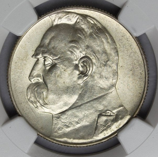 Polska moneta obiegowa wydana przez Mennicę Warszawską. Moneta upamiętnia marszałka Polski Józefa Piłsudskiego. Józef Piłsudski żył w latach 1867-1935, dwukrotnie był premierem Polski i wywarł decydujący wpływ na kształt polityki wewnętrznej i zagranicznej II RP. Brał udział w I wojnie światowej, wojnie polsko-bolszewickiej, bitwie warszawskiej i wielu innych. Po klęsce Niemiec zwolniony z więzienia Piłsudski udał się do Warszawy, gdzie otrzymał naczelne dowództwo nad polskimi wojskami. Śmierć Józefa Piłsudskiego 12 maja 1935 roku zaskoczyła cały naród. Do niemal ostatniej chwili ukrywał on nieuleczalną chorobę - raka wątroby. Jego pogrzeb stał się ogromną manifestacją narodową oddającą hołd zmarłemu Marszałkowi. Ciało zostało pochowane w krypcie św. Leonarda w Katedrze na Wawelu , obok pokoleń królów i najwybitniejszych Polaków. Moneta została wycofana z obiegu zgonie z rozporządzeniem ministra i należało obowiązkowo wymienić ją na pieniądze papierowe. Moneta w bardzo ładnym stanie zachowania w slabie NGC, MS 64.