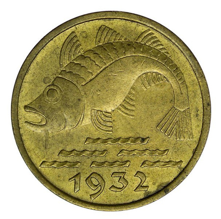 Moneta z Wolnego Miasta Gdańsk z 1932 roku o nakładzie 5 000 000 sztuk. Wolne Miasto Gdańsk istniało w okresie międzywojennym, pod ochroną Ligi Narodów. Powodem powstania Wolnego Miasta Gdańsk było przegranie I wojny światowej przez Niemców. Na mocy traktatu wersalskiego Gdańsk został odłączony od Rzeszy Niemieckiej, obszar został zdemilitaryzowany. Państwo-Miasto posiadało własną konstytucję zatwierdzoną przez Ligę Narodów oraz hymn, Parlament i Senat. Gdańsk po II wojnie światowej został przyłączony do terytorium Polski. Moneta z menniczym połyskiem.