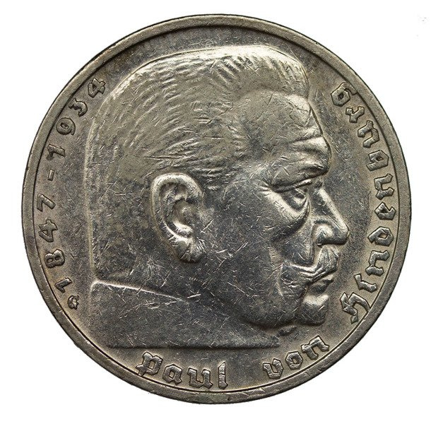 Niemiecka srebrna moneta o nominale 5 marek. Na monecie przedstawiony jest prezydent Republiki Weimarskiej i III Rzeszy Paul von Hindenburg. Mennica G, Karlsruhe.