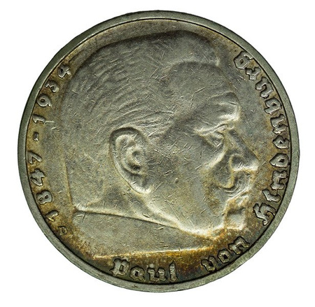 Niemiecka srebrna moneta o nominale 5 marek. Na monecie przedstawiony jest prezydent Republiki Weimarskiej i III Rzeszy Paul von Hindenburg. Mennica D, Monachium.