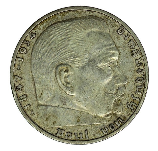Niemiecka srebrna moneta o nominale 2 marek. Na monecie przedstawiony jest prezydent Republiki Weimarskiej i III Rzeszy Paul von Hindenburg. Mennica A, Berlin